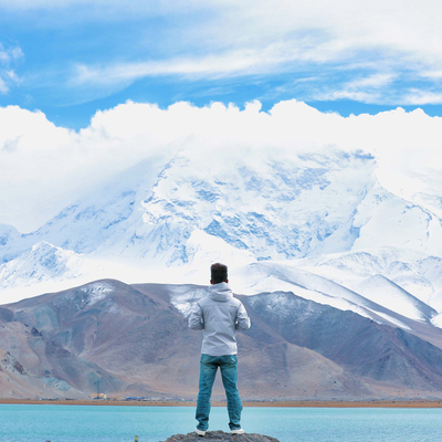 ②喀湖会根据光照的角度,湖水从蓝到黑,可步行至木栈道观赏慕士塔格峰的巍峨;
