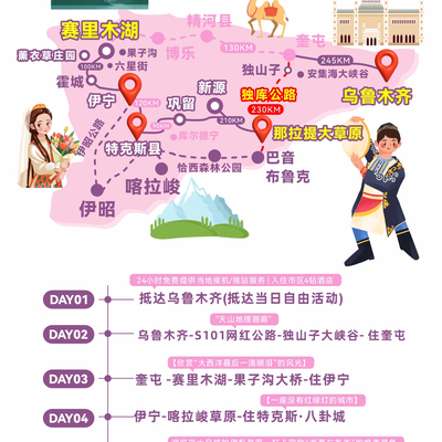7、【其他指南】:为了避免大家在新疆旅行时留下遗憾,请记得留意自己的手机电量和内存容量,以便将一路的大美风光和民俗民风拍照留念。平时体质较弱的游客,有可能会出现水土不服的状况。所以建议自备一些常用药,以及感冒药或肠胃药等。