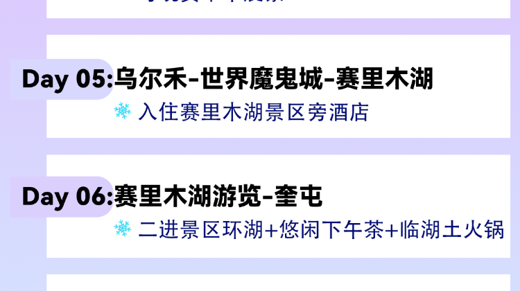 【行程里程】:相关部门规定,旅游车辆每日行车不得超过600公里,产品行程设计的每日里程均在600公里要求内,但受车辆GPS信号等影响,可能部分日期会出现设计里程和实际里程有差异,如GPS显示当日里程接近600公里时,我们将安排临近其他车辆进行短驳,敬请理解!